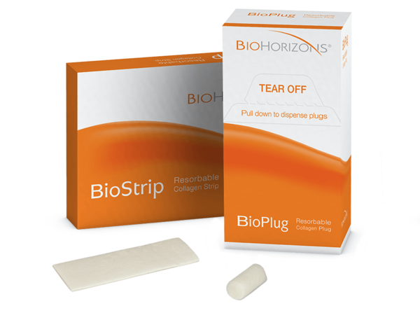 The BioStrip and BioPlug collagen wound dressings complement the bone substitute materials and membranes in the regeneration materials range. The wound dressings of bovine origin support the body’s own collagen synthesis and absorb blood and other fluids to protect treated regions. They provide for accelerated granulation and epithelization and for good regeneration of the surgical site. BioStrip is used to close transplanted areas and cover small wounds. The BioPlug collagen plug is used to seal extraction sockets and biopsy sites. The wound dressings are completely resorbed after 10 to 14 days.